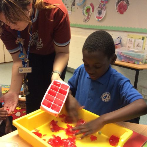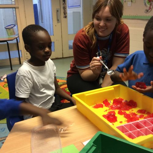 We have been reading the story “Topsey and Tim have a birthday party” In the story they had jelly at their party. We had a fun time in sensory play. We got to take the jelly out of the tray, it was very wobbly and kept slipping out of our hands which was funny and made us laugh, It smelt like raspberries, we tasted it and it was very yummy. It was also fun to squeeze it in our hands.